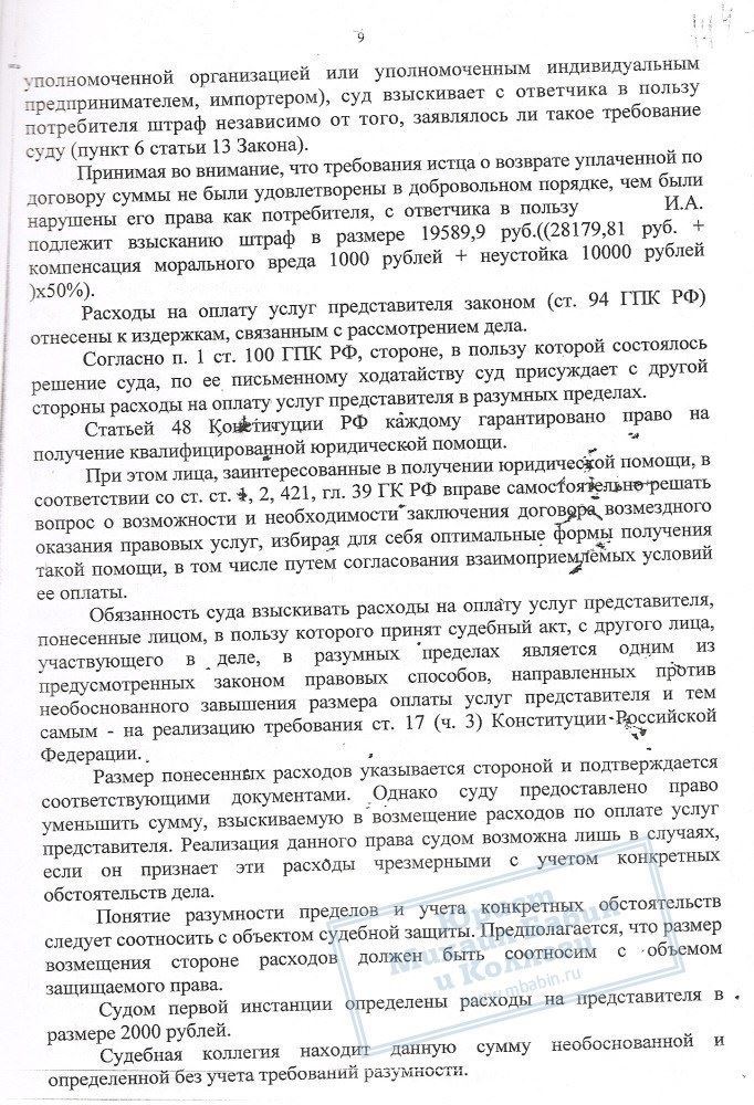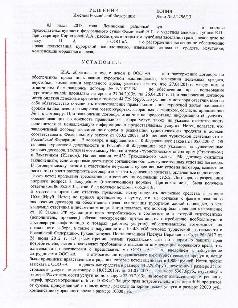 В ходе судебного заседания было доказано, что А. услуги по договору оказаны не были, в связи с этим судом было принято решение о расторжении договора между истцом и ответчиком, а также взыскание суммы, выплаченной А. ОАО "А******" по договору, компенсация морального вреда, расходы на оплату услуг юриста, неустойка за несвоевременность возвращения денежных средств, а также штраф в размере 50% от взысканной суммы за несоблюдение туристическим агентством закона о защите прав потребителей. Всего нашему клиенту было выплачено 65 000 рублей (+16 000 выплаченные ему ранее в добровольном порядке).